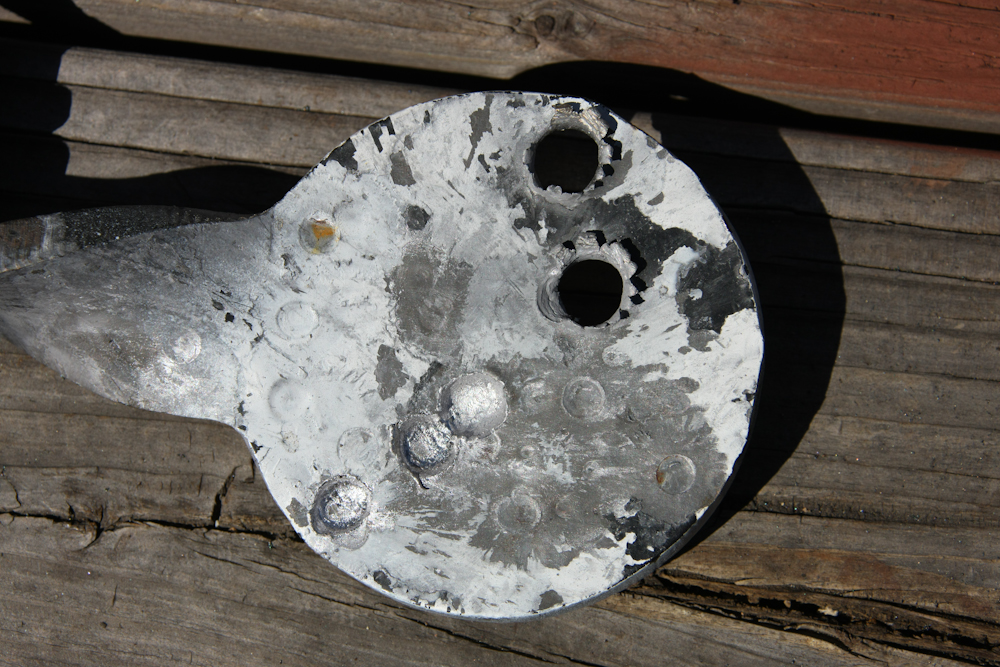 In preparation for our hog hunt, we had to insure that the weapons were sighted in and on target. Test firing before use is common sense as it might identify potential failures that may occur when you are in the field. For the sighting, I selected a pistol target made from 3/8 inch steel plate. We shot from 50 yards, about 150 feet from the target. Shots were taken from the kneeling position with a Winchester model 1895 .30/30 and from a .300 Savage Model 99. The .300 punched right through the plate while the 30/30 put some nice dents in the plate. The small dents are from my .45 ACP rounds. Our conclusion was that the rifles will perform acceptably well for the task at hand. One note: I did not intend to damage my target, it happend because I did not understand that the 300 would punch through the steel plate.