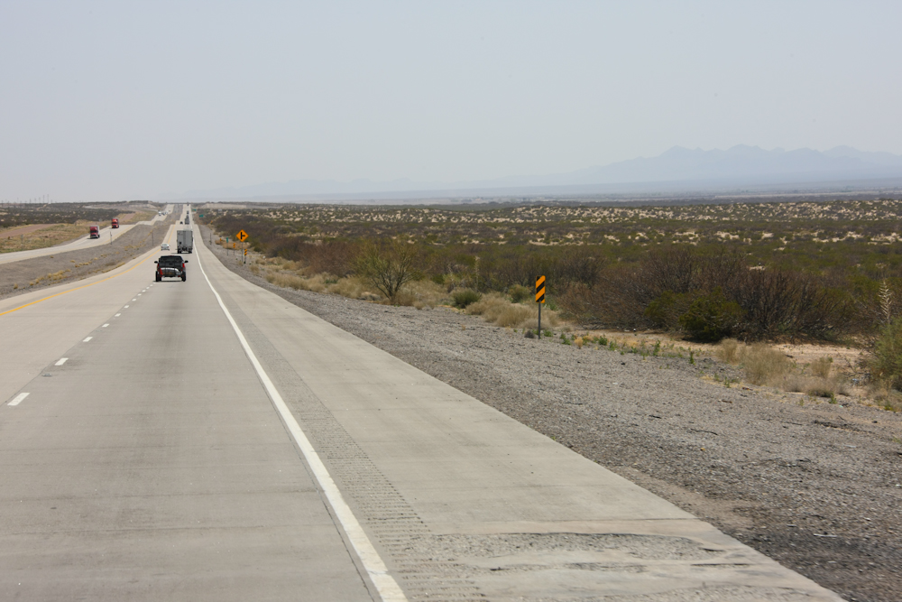 Further east, the road was flat and straight. Turns were rare and something to be celebrated.