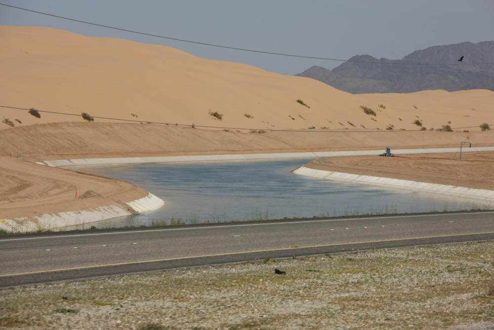 The All American Canal (named because the canal stays within the limits of the U.S.) recently got lined with concrete to prevent water loss by seepage into the sand. The local slogan is "food grows where water flows".